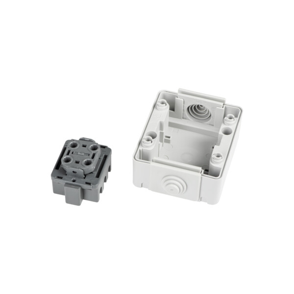 Łączniki serii TEKNO IP65 charakteryzuje wysoka odporność na warunki atmosferyczne, dzięki starannemu uszczelnieniu konstrukcji. Łatwy montaż zapewniają kołki montażowe na 1/4 obrotu oraz demontowalne wnętrze. Łącznik pojedynczy posiada mechanizm uniwersalny, dzięki któremu ten sam mechanizm można stosować jako łącznik pojedynczy lub schodowy.